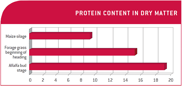 A field composed of forage grasses and alfalfa provides more protein than a field of forage grass, maize silage or soybean. What is more, the deep rooting system helps farmers maintain or even increase feed production during dry seasons.