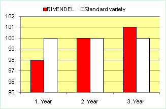 Source: Results from official trials in Denmark showing the drymatter yield| RIVENDEL | Standard variety | |